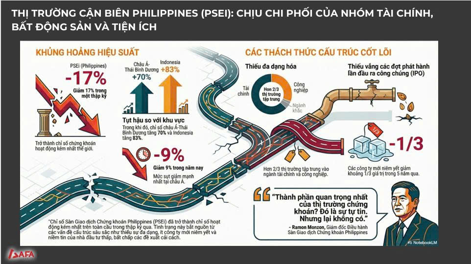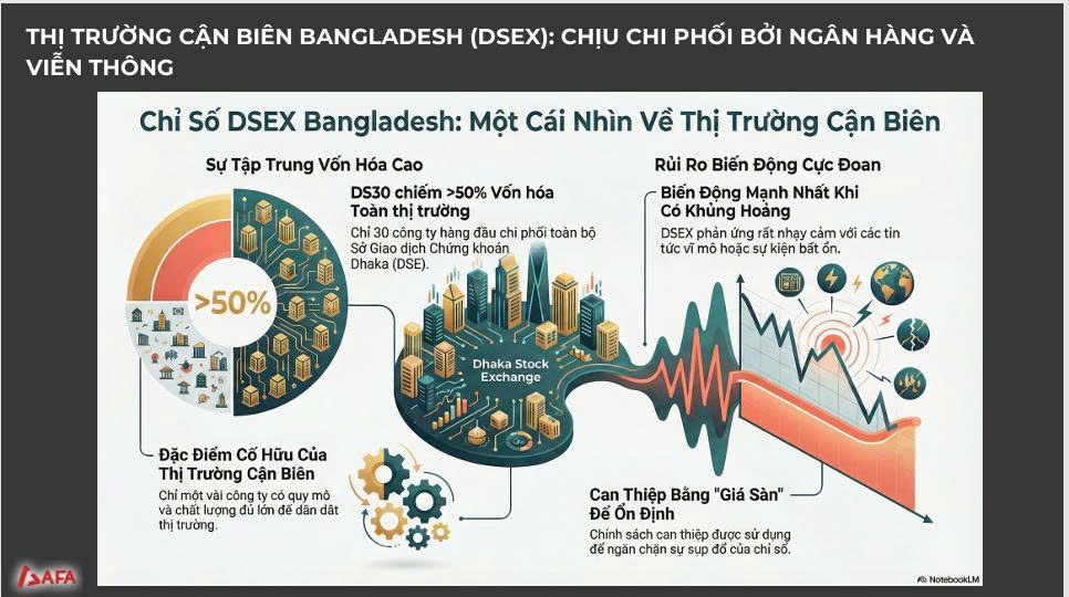 Thị trường chứng khoán của Bangladesh có chút ổn định hơn tuy nhiên vẫn bị chi phối bởi Ngân hàng và Viễn thông. Đặc điểm cố hữu của thị trường cận biên là rủi ro biến động cực đoan do sự tập trung vốn hóa vào một số ít công ty lớn.