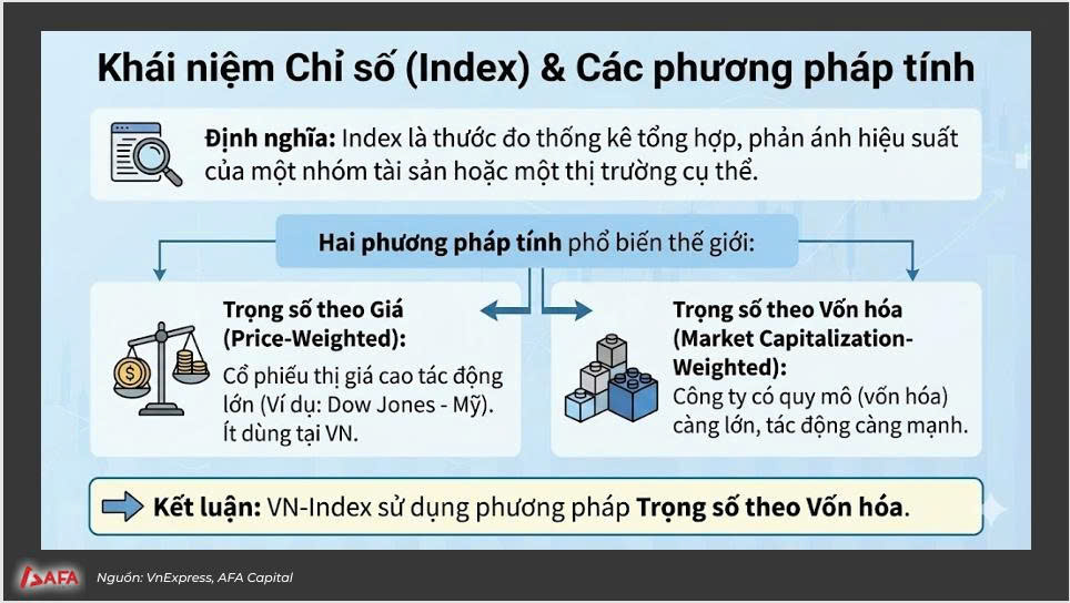 - Trọng số theo Giá (Price-Weighted): Cổ phiếu có thị giá cao sẽ tác động lớn (ví dụ: Dow Jones của Mỹ). Việt Nam ít dùng phương pháp này