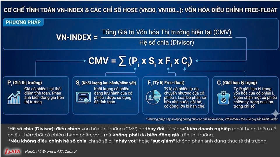 - Hệ số chia (Divisor): Điều chỉnh để đảm bảo chỉ số không bị “nhảy vọt” hoặc sụt giảm do các sự kiện doanh nghiệp (như phát hành thêm cổ phiếu) thay vì biến động giá thị trường
