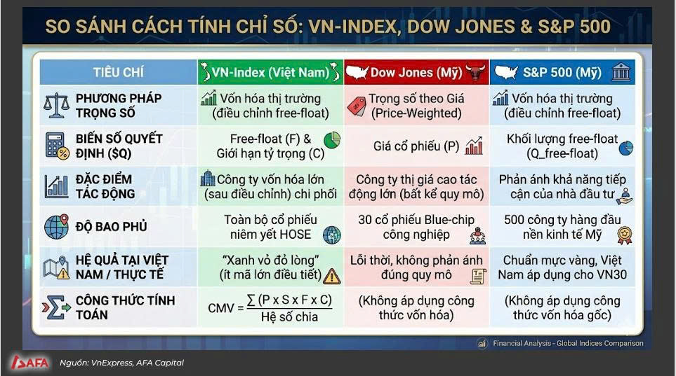 - S&P 500 (Mỹ): Dùng vốn hóa thị trường, gồm 500 công ty hàng đầu. Đây là chuẩn mực vàng, phản ánh khả năng tiếp cận của nhà đầu tư.