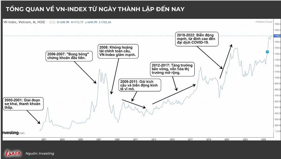 Biểu đồ VN-Index từ năm 2000 đến 2025 cho thấy các giai đoạn thăng trầm gắn liền với sự thay đổi của các nhóm cổ phiếu trụ cột, từ giai đoạn sơ khai, bong bóng 2007, khủng hoảng 2008 đến giai đoạn phục hồi và tăng trưởng sau Covid-19