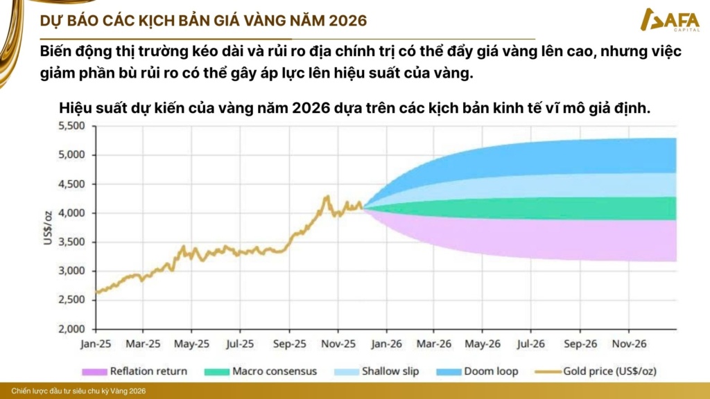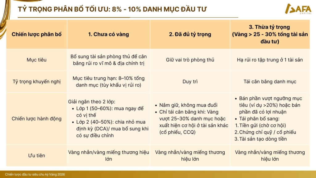 • Nguyên tắc: Nắm giữ dài hạn, không mua đuổi, chỉ tái cân bằng khi tỷ trọng vàng vượt quá 25-30% danh mục.