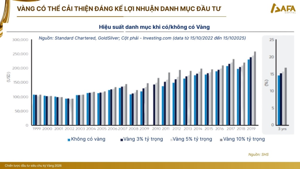 • Việc bổ sung Vàng (3-10% tỷ trọng) giúp cải thiện đáng kể hiệu suất danh mục.