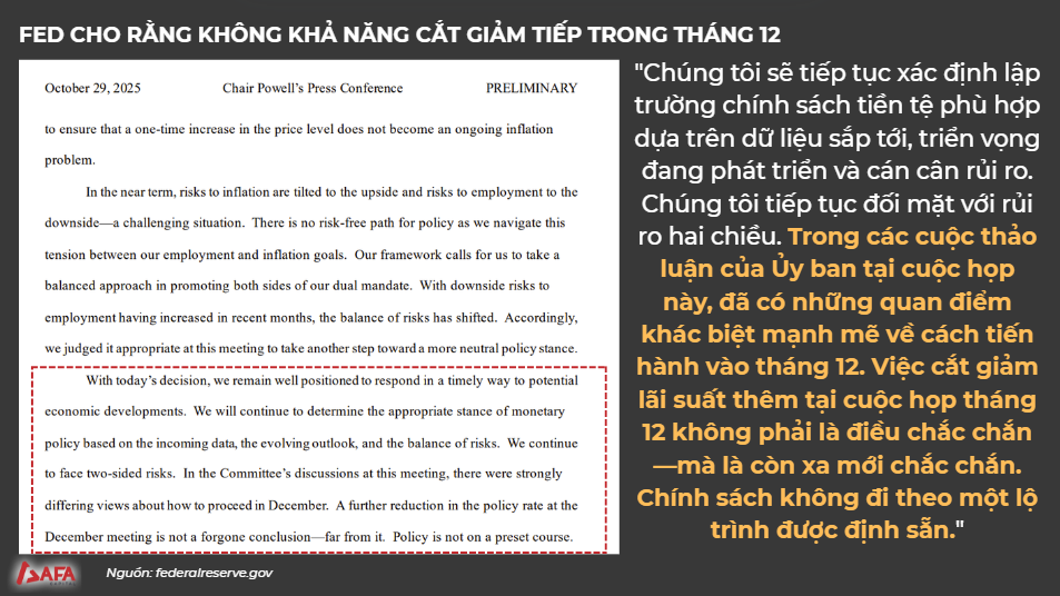 Trong cuộc họp của FOMC tháng 10/2025, Powell cho rằng việc cắt giảm lãi suất thêm không phải là điều chắc chắn