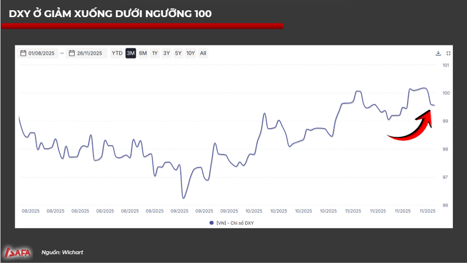 Chỉ số sức mạnh đồng USD – DXY, giảm xuống dưới ngưỡng 100 khi khả năng FED hạ lãi suất giảm