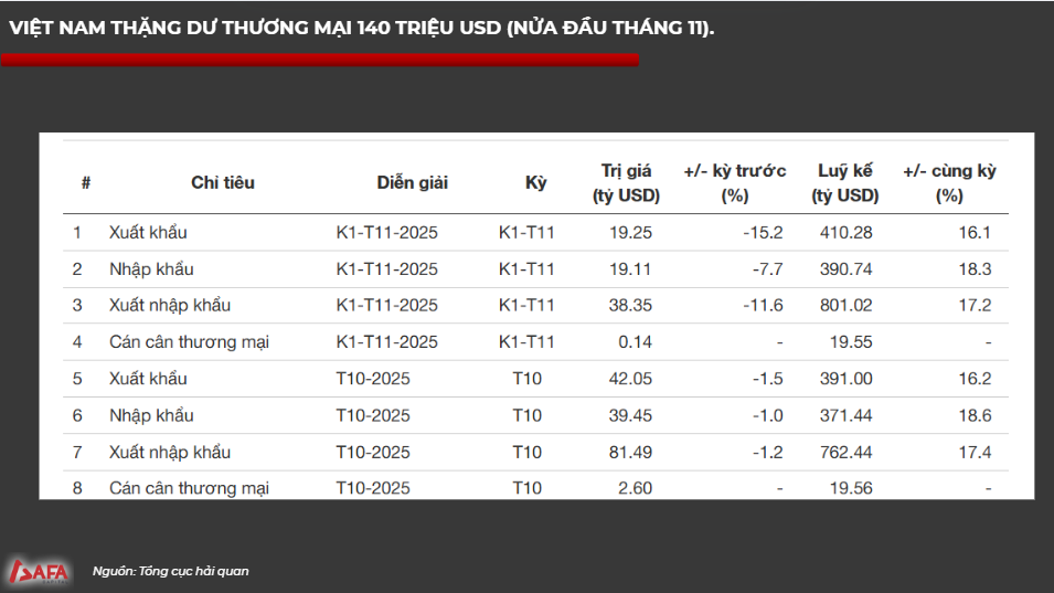 Cán cân thương mại nửa đầu tháng 11 vẫn dương, tuy nhiên xuất khẩu vẫn âm so với tháng 10