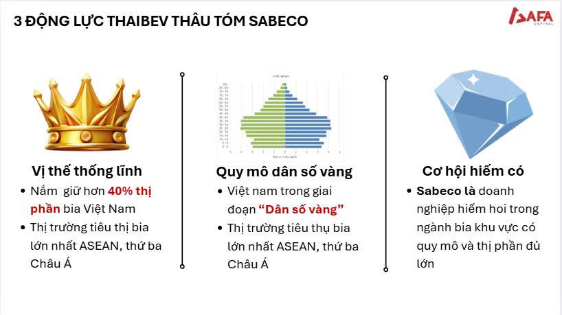 Vĩ mô dân số vàng của Việt Nam và Sabeco là doanh nghiệp duy nhất có quy mô đủ lớn: ThaiBev trả một mức phí kiểm soát lớn (P/E khoảng 40 lần, gấp đôi Vinamilk) để sở hữu doanh nghiệp hiếm hoi có quy mô đủ lớn trong một quốc gia đang có tỷ lệ dân dân số vàng và đang phát triển kinh tế tốt như Việt Nam.