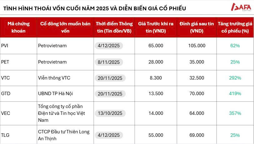 Một bảng danh sách các thương vụ thoái vốn (thường là thoái vốn của SCIC, hoặc các cổ đông lớn nhà nước) và sự biến động giá cổ phiếu liên quan đã được trình bày, cho thấy hầu hết các cổ phiếu đều tăng giá mạnh mẽ khi thông tin thoái vốn được công bố.